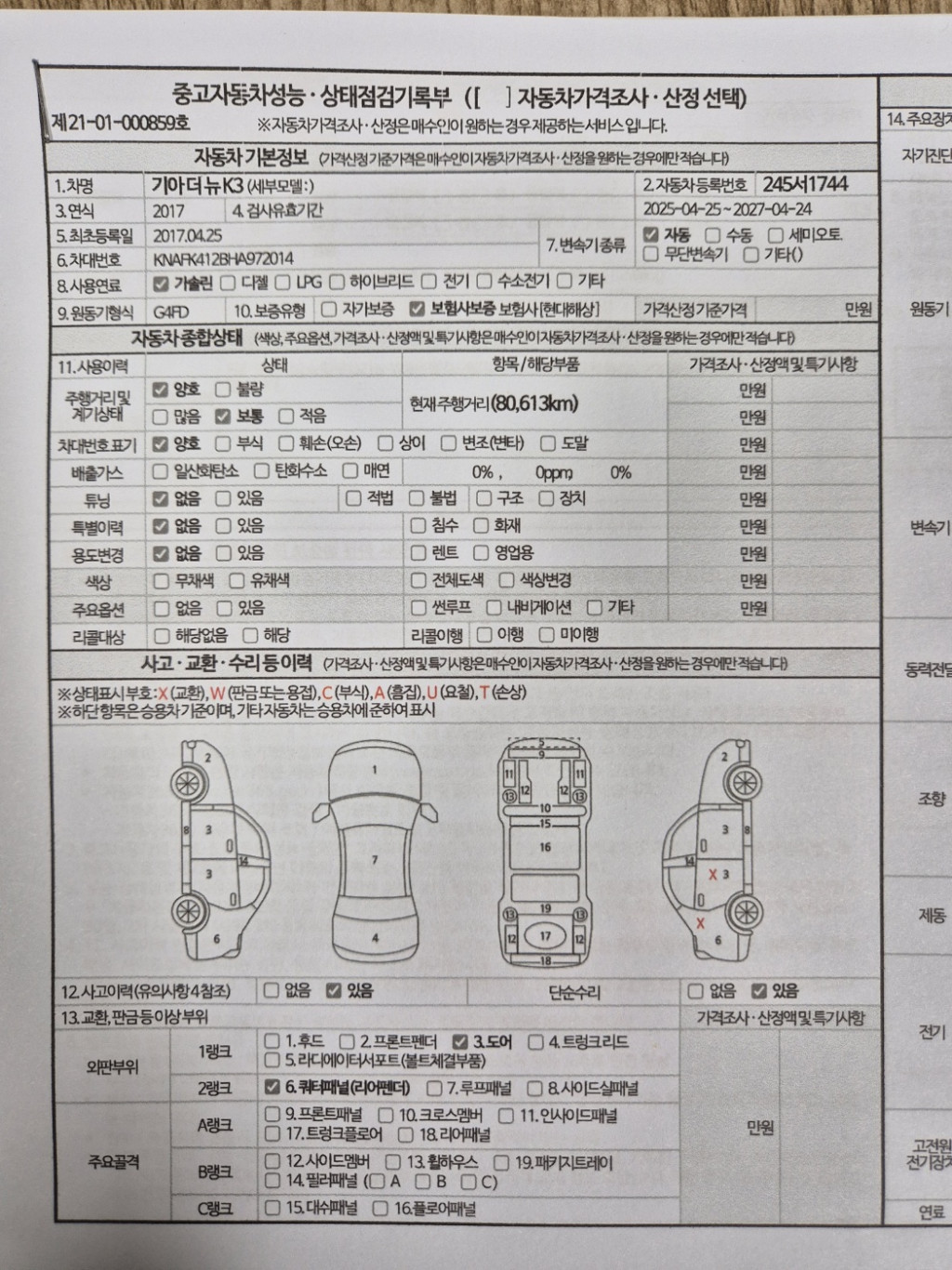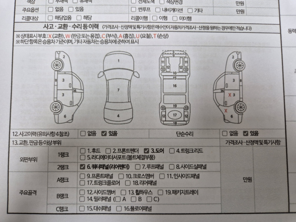 사고이력 : 사고(단순문1,뒤휀다)